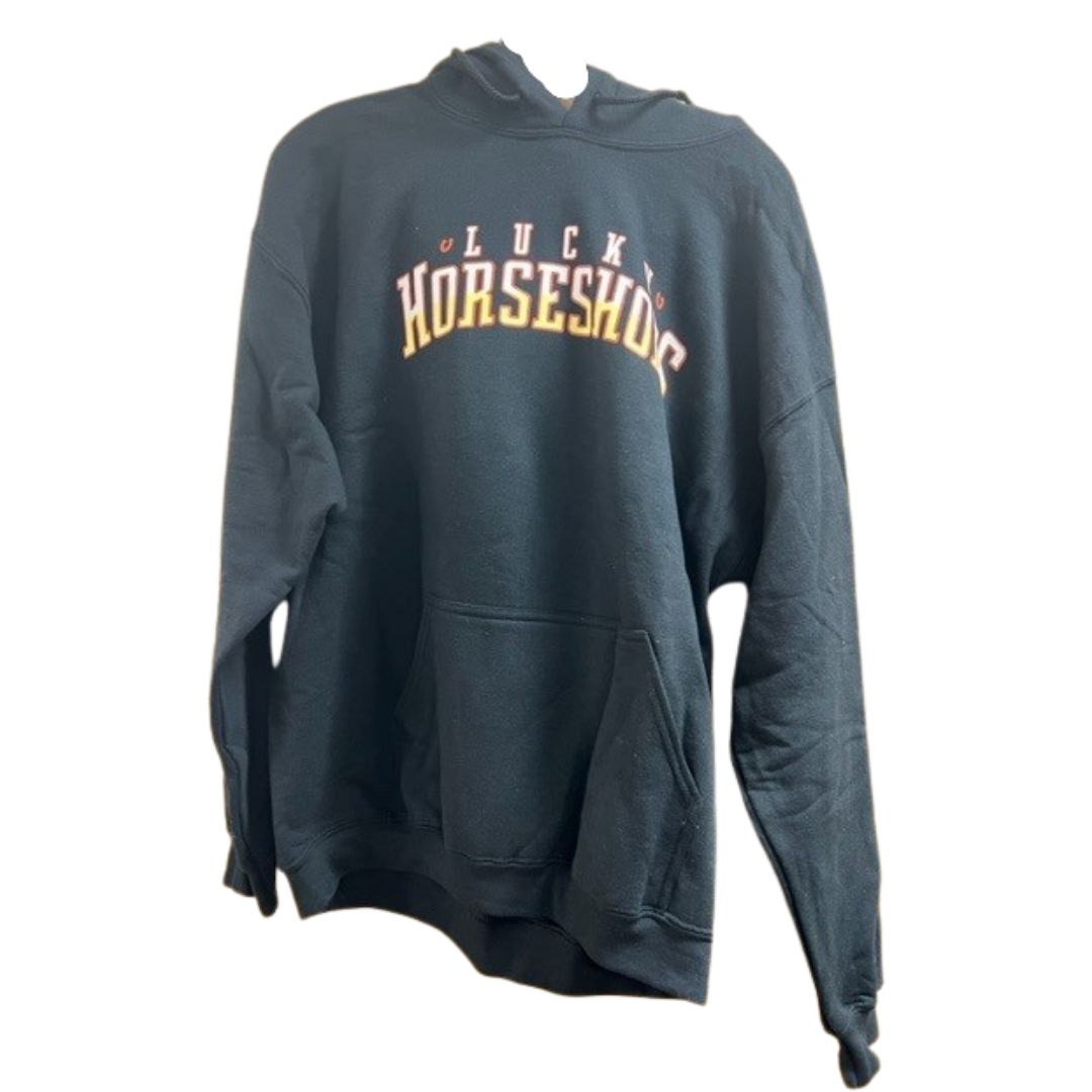 Cozy Lucky Horseshoes hoodie with the same logo style as the neon videoboard topper!