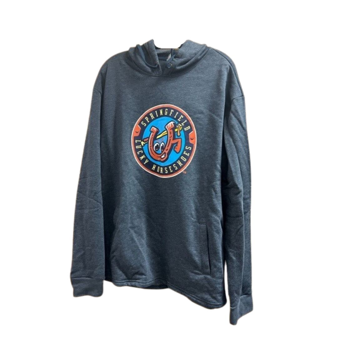 This is a heather navy, welt pocket, Lucky Horseshoes primary logo hoodie made from 60/40 cotton/polyester material.